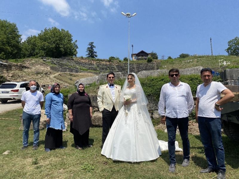 DÜZCE (İHA) – Düzce Belediyesi ve Kültür Bakanlığı tarafından kazı çalışmaları yürütülen Prusia ad Hypium Antik Kenti’nde güzel anlar yaşandı. Düzce Belediyesinde görevli olan ve düğünü olduğu için izin alan gelin Sinem Öztürk, giydiği gelinliği ile kazı çalışması yapan arkadaşlarını yalnız bırakmadı. Gelinlikle kazı alanına gelen Sinem Öztürk ve damat Yavuz Yiğit, günü anısı olarak hatıra fotoğrafı çektirmeyi de ihmal etmediler.