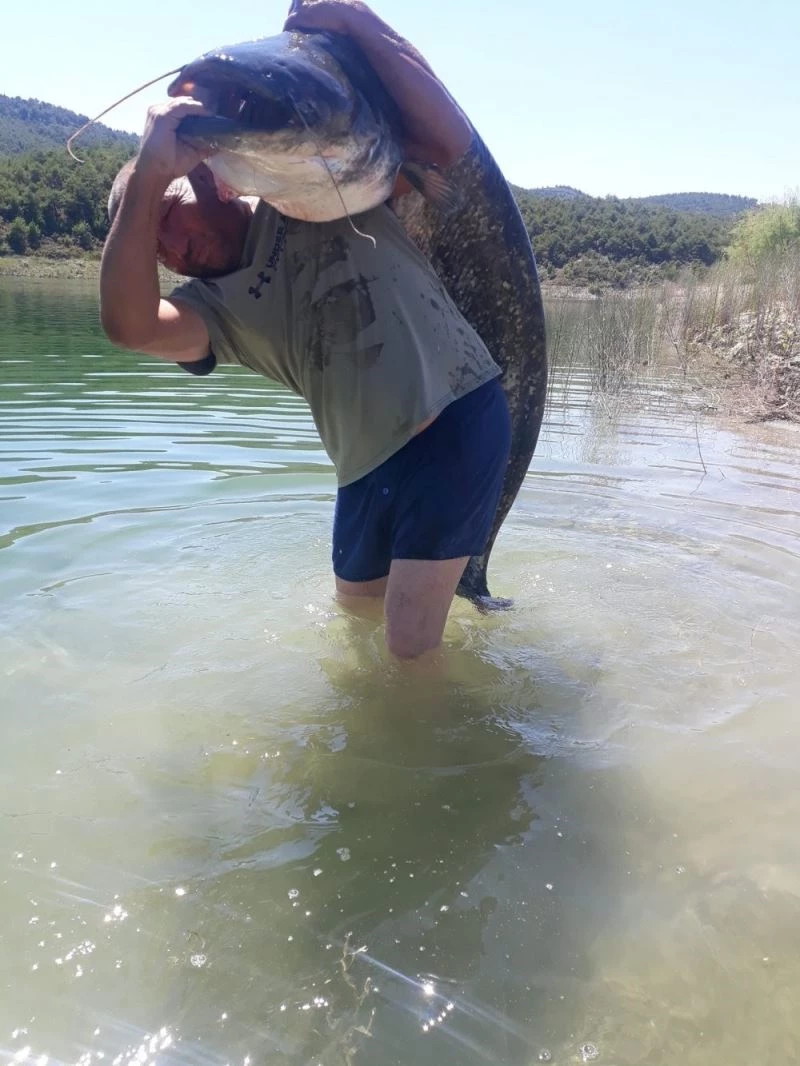 Sinop’un Durağan ilçesinde bir amatör balıkçı barajda yakaladığı 80 kiloluk yayın balığını sırtında zor taşıdı.