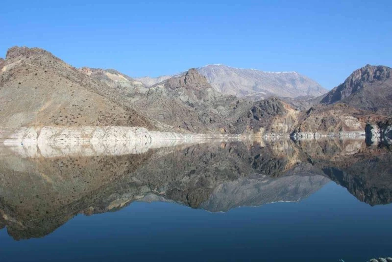 Erzurum’un Oltu ilçesindeki Ayvalı Barajı’nda berrak suya dağların yansıması kartpostallık görüntüler oluşturdu.