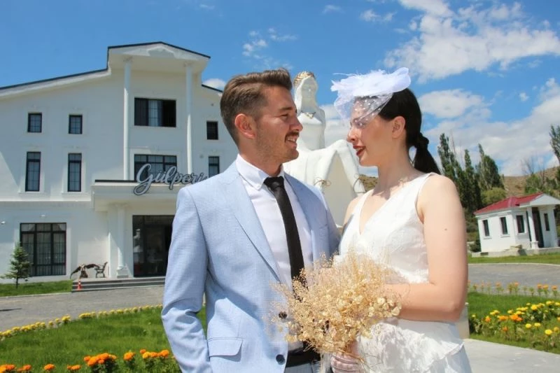 Yeni evlenen genç çiftler Gülperi Otelindeki Gülperi heykeli ile resimler çekilip otelde ilk gecelerini geçiriyorlar.