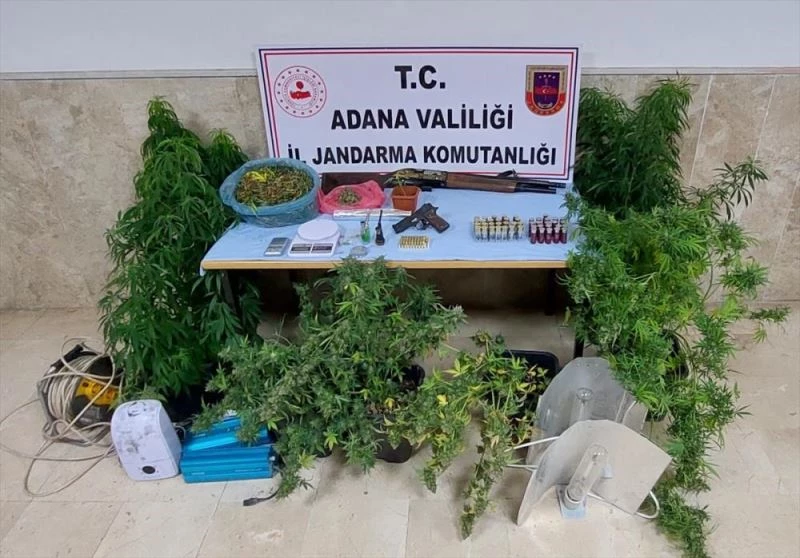 Evdeki saksılarda 8 kök skunk bitkisi, 544 gram esrar, 2 hassas terazi, dijital termometre, tabanca, şarjör, ruhsatsız av tüfeği, iklimlendirme sistemi ile tüfek fişekleri ele geçirildi.