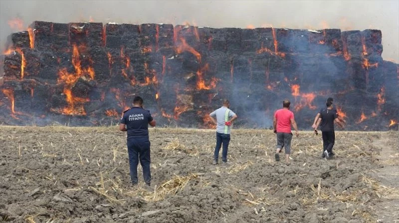 ADANA - Adana'nın Ceyhan ilçesinde mısır silajı balyalarının bulunduğu tarlada çıkan yangın kontrol altına alınmaya çalışılıyor.