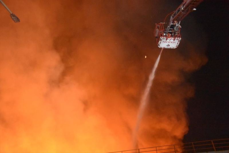 Ihbar üzerine bölgeye sevk edilen Büyüksehir Belediyesi itfaiye ekipleri, fabrikanin büyük bölümünü saran alevlere müdahalede bulunuyor.
