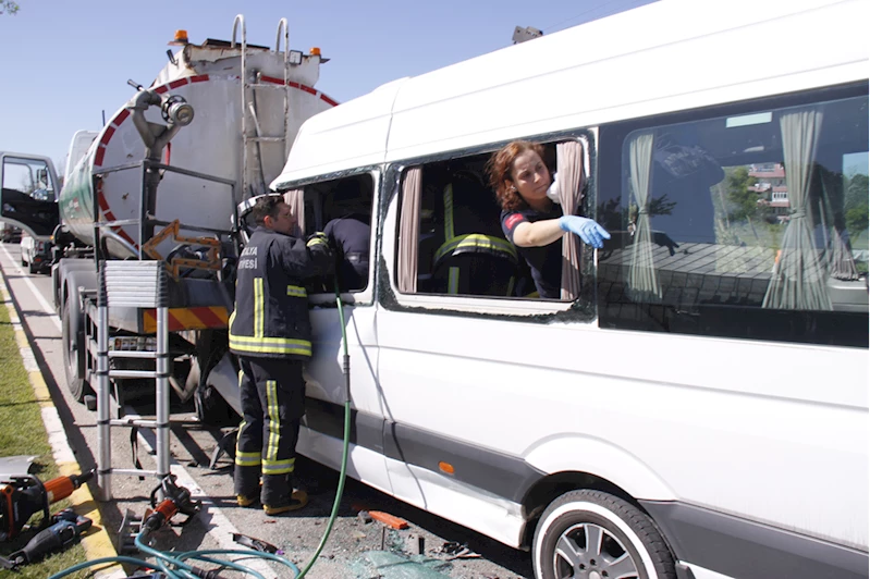 İtfaiye ve sağlık ekipleri, minibüste sıkışan sürücüyü vinç yardımıyla 3 saatlik çalışmanın ardından araçtan çıkardı.