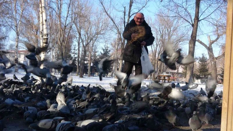 Ardahan’da termometreler gece eksi 18,3 dereceyi gösterdi. Kar yağışının ardından kentte dondurucu soğuklar etkili oldu. Olumsuz hava şartları nedeniyle yem bulamayan güvercinleri emekli maaşıyla aldığı yemle besliyor.