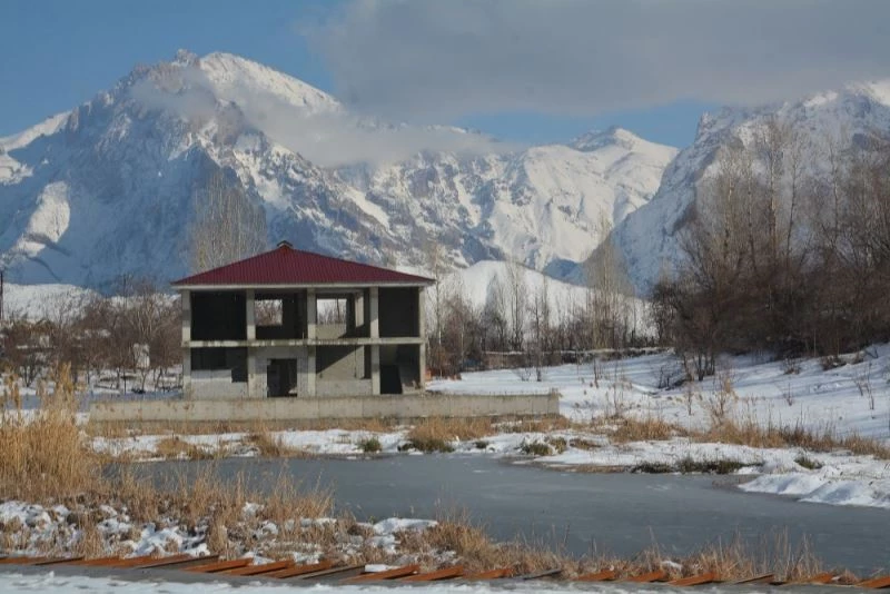 Hakkari’de kar yağışının yerini soğuk havaya bırakmasıyla birlikte Golazüryan Göleti dondu.