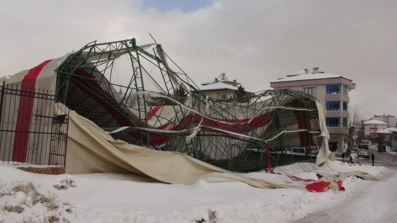 Malatya’nın Doğanşehir ilçesinde kar kütlesinin ağırlığına dayanamayan halı sahasının çatısı çöktü. Çatısı çöken halı sahada maç oynama hazırlığı yapıldığı, vatandaşlar halı sahaya girmeden hemen önce çatının çöktüğü ve muhtemel büyük bir facianın eşiğinden dönüldüğü ortaya çıktı.
