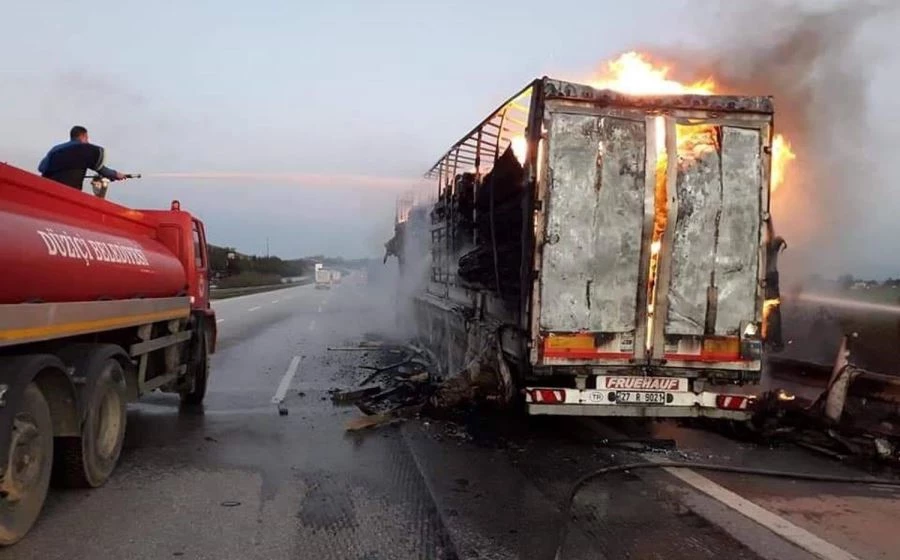 Olay sabah saatlerinde E90 Otoyolu Düziçi Turnikeleri mevkiinde meydana geldi. Gaziantep yönünden Adana istikametine seyir halinde olan Mesut K. idaresindeki 27 R 9021 plakalı halı yüklü TIR'ın dorsesi biranda alev aldı. Sürücü çekiciyi dorseden ayırıp durumu hemen itfaiyeye bildirdi. Olay yerine kısa sürede ulaşan Osmaniye ve Düziçi Belediyelerine ait itfaiye ekipleri, alevlere müdahale ederek yangını söndürdü. Dorse ise içerisindeki halılarla birlikte yanarak kullanılamaz hale geldi. Jandarma araç yangınıyla ilgili soruşturma başlattı.