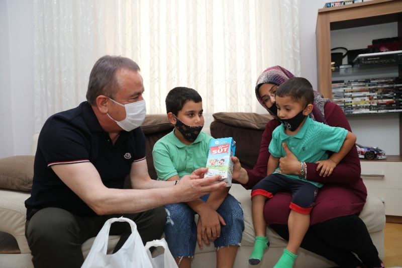 Antalya Büyükşehir Belediye Başkanı Muhittin Böcek’in, seçim vaatleri arasında yer alan “Halk Süt” projesinde sütler çocuklarla buluşmaya başladı. Antalya Büyükşehir Belediyesi’ne yapılan başvurular sonucu ihtiyaç sahibi olduğu tespit edilen ailelerin 2-5 yaş arasındaki çocuklarına süt dağıtımları yapılıyor. Büyükşehir Belediye Başkanı Muhittin Böcek de annesi Tuğba Cihan’ın başvurusuyla 3 yaşındaki Toprak’a sütünü teslim etti. Başkan Böcek, Toprak ile ağabeyi Kutlu’ya kırtasiye seti de hediye etti.