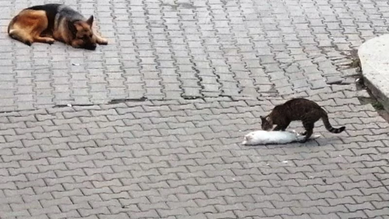Zonguldak’ın Gökçebey ilçesinde bir kedi ölen başka bir kediye patileriyle ayağa kaldırmak için verdiği mücadelesi bir vatandaşın cep telefonuna yansırken o anları ise köpek, güvercin ve karga da dikkatle izledi.