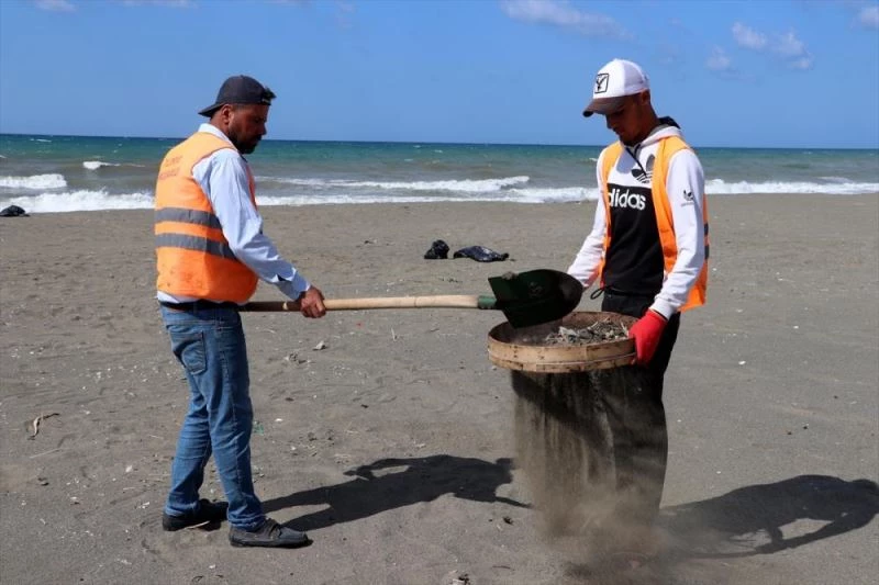 Ekipler, tırpan ve kürek kullanarak kumsaldan topladıkları atıkların kumlarını eleyip çöp poşetlerine dolduruyor.