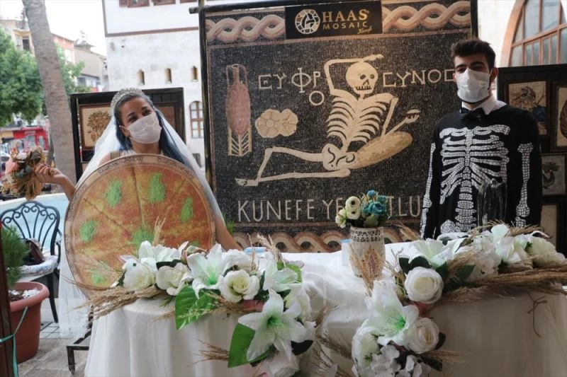 Antakya ilçesinde bir künefecinin açilisinda 2012 yilinda kentte teleferik projesinin yapimi sirasinda bulunan Roma dönemine ait ve üzerinde 'Neseli ol hayatini yasa" yazili mesaj olan mozaik ile yöresel tatli künefe kostümleri giyen çiftin temsili nikahi kiyildi.
