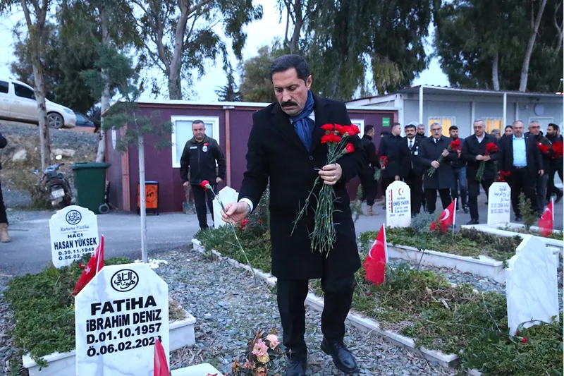 Vali Mustafa Masatlı ve AK Parti Genel Başkan Yardımcısı Hüseyin Yayman ile diğer protokol üyeleri, 6 Şubat'taki depremlerde hayatını kaybedenlerin defnedildiği Narlıca Deprem Mezarlığı'ndaki anma programına katıldı.