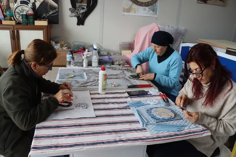 Kadınlar, cam ve plastik şişe, mukavva, kiremit ile tahtalara tutkalla yapıştırdıkları taşlardan tablo, bardak altlığı, kitap ayracı, bileklik ve magnet gibi ürünler yapıyor.