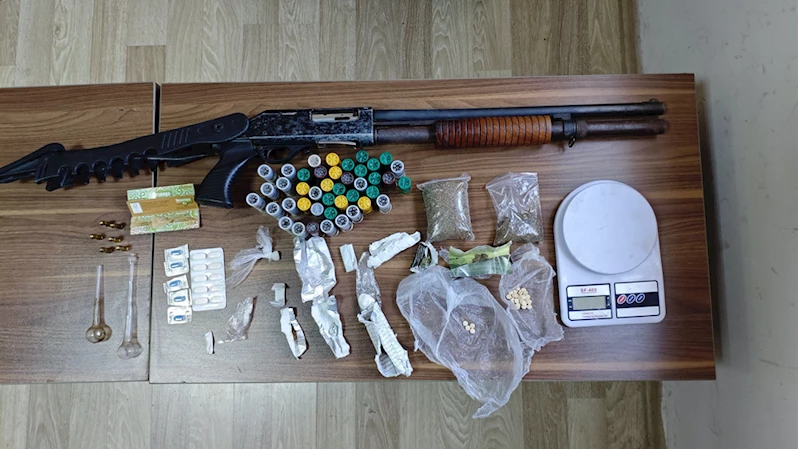 Adreste 40 gram esrar, 49 uyuşturucu hap, ruhsatsız tüfek, 42 fişek, 6 mermi ve hassas terazi ele geçirildi.