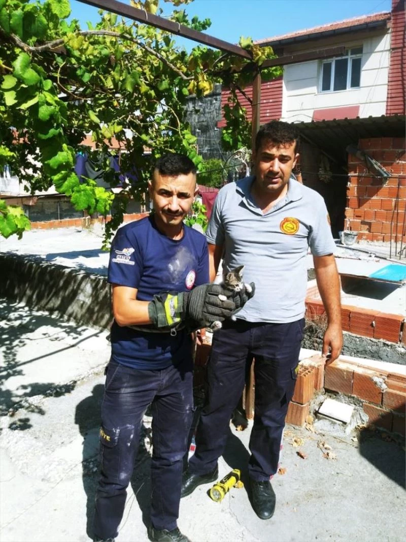 Hatay'da iki evin arasındaki boşluğa düşen kedi yavrusunu itfaiye ekipleri kurtardı