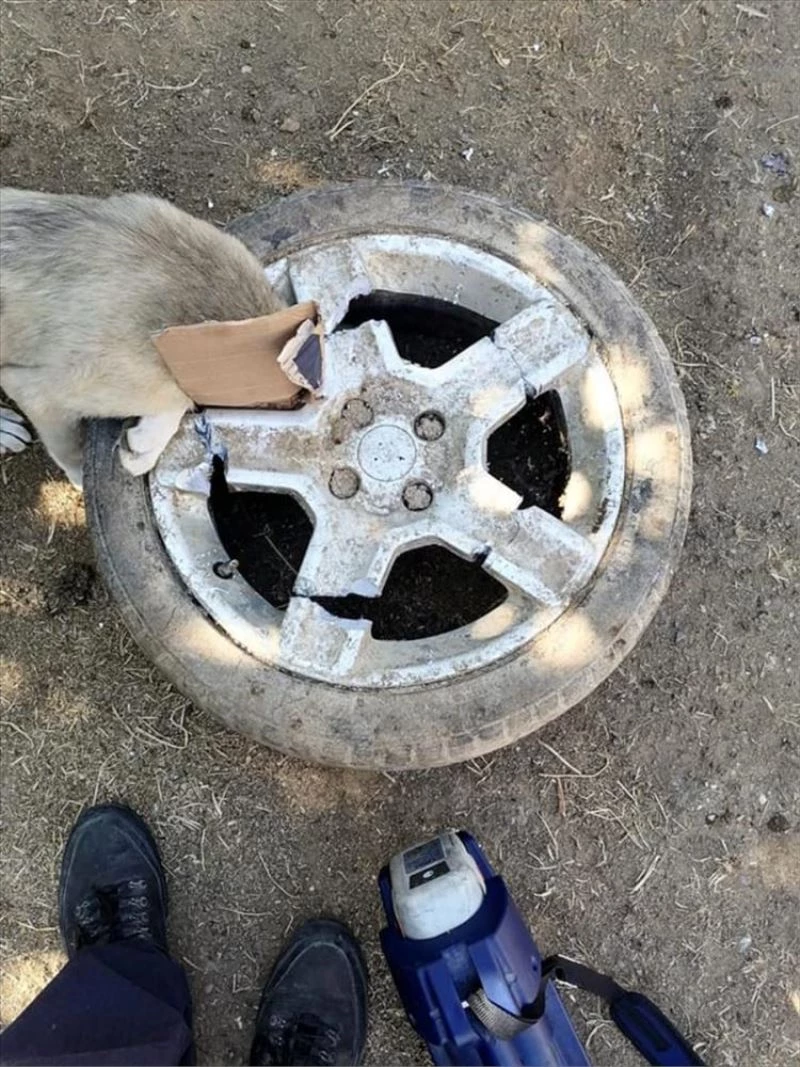 İhbarı üzerine olay yerine gelen itfaiye ekipleri otomobilin tekerini sökmesinin ardından jantı dikkatli şekilde keserek köpeği sıkıştı yerden çıkardı.