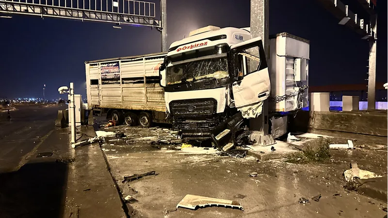 Hatay'da otoyol gişelerinde direğe çarpan tırda yangın çıktı