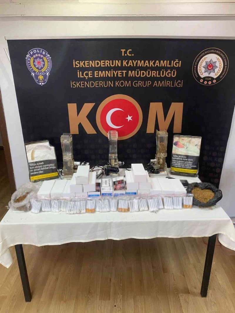 Hatay’ın Payas ilçesinde bir evde gümrük kaçağı 7 bin adet makaron, 15 kilogram kaçak tütün, elektronik sigara sarma makinesi ele geçirildi.