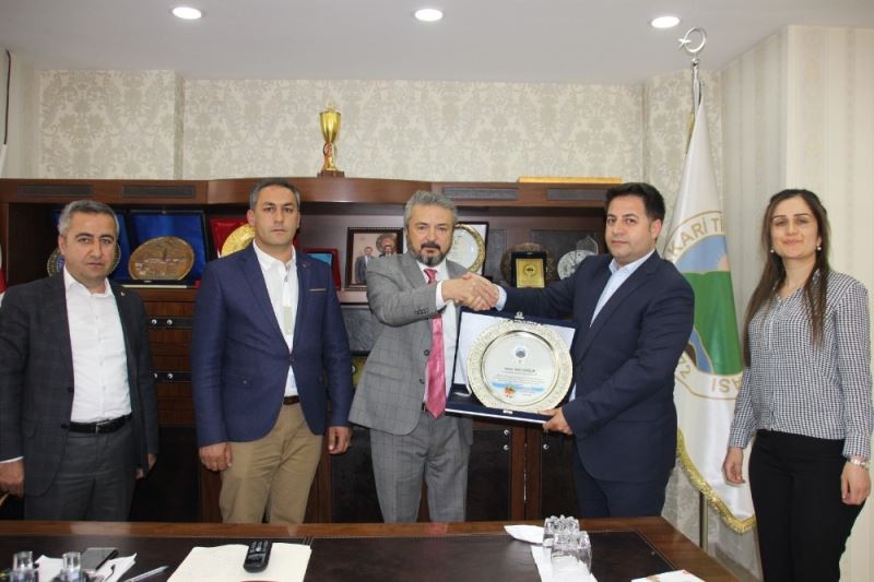 HATSO Başkanı Servet Taş, odayı ziyaret eden Halkbank Hakkari Şube Müdürü Tahir Şimşek’e plaket takdim etti.