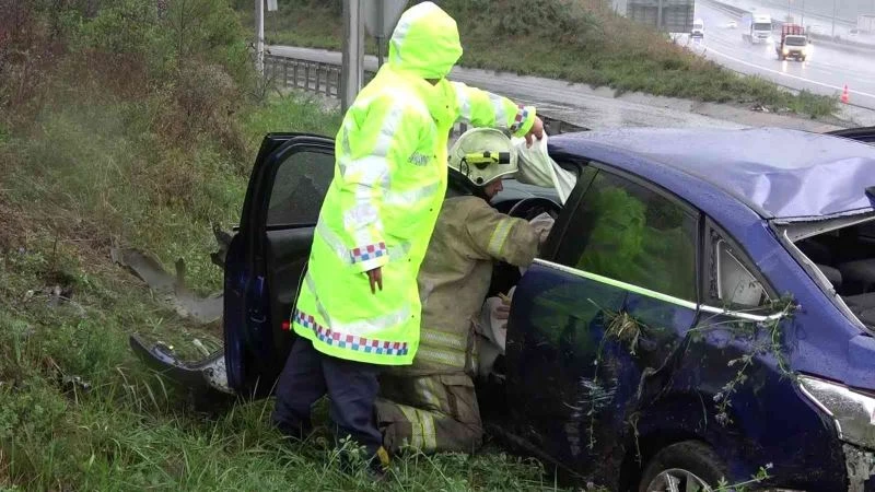 Kaza, dün saat 13.00 sıralarında Kuzey Marmara Otoyolu Fenertepe yol ayrımı mevkiinde meydana geldi. Edinilen bilgiye göre, Selda S., 26 AEK 943 plakalı aracı ile kavşağa geldiği esnada yağmurlu hava nedeniyle direksiyon hakimiyetini kaybetti. Araç, otoyol kenarındaki bariyerleri aşarak çayırlık alana uçtu. İhbar üzerine olay yerine itfaiye, sağlık ve jandarma ekipleri sevk edildi. Jandarma ekipleri kaza yeri ve çevresinde geniş güvenlik önlemi aldı. Araç içerisinde sıkışan kadın itfaiye ekiplerince çıkartılarak Başakşehir Çam ve Sakura Şehir Hastanesi’ne kaldırıldı. Kadını kurtarma çalışmalarında bir itfaiye eri araç içerisine girerek, korkan Selda S.’nin elini tutup sakinleştirmeye çalıştı.