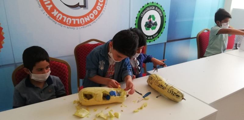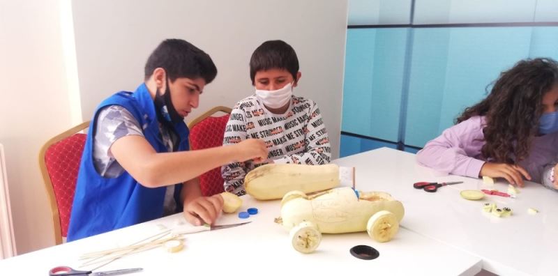 Erzurum Gençlik ve Spor İl Müdürlüğü Aziziye Gençlik Merkezi Tasarım Atölyesinde eğitim gören minik kaşifler, kabaktan araba ve uçak tasarımları yapıyorlar.