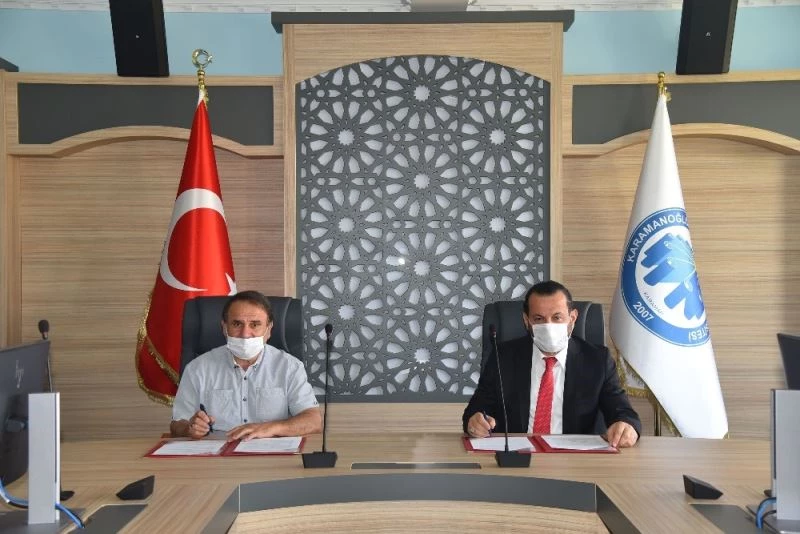 Karamanoğlu Mehmetbey Üniversitesi (KMÜ) Rektörü Prof. Dr. Mehmet Akgül ile Hayırsever Mustafa Demircan arasında KMÜ Kazım Karabekir Yerleşkesinde yapılacak cami için protokol imzalandı.