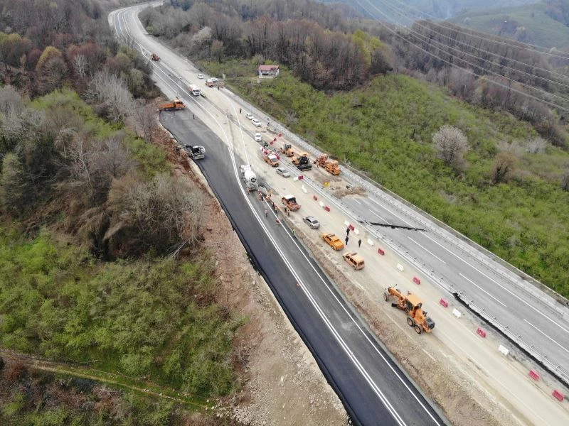 Geçtiğimiz hafta sağanak yağış ile beraber Düzce-Zonguldak yolunda heyelan meydana gelmiş ve yol trafiğe kapatılmıştı. Ağır tonajlı araçlar farklı yollara yönlendirilirken, binek araçlar ise köy yollarından Akçakoca ve Ereğli’ye gidiyor. Heyelan olan bölgede Düzce Valisi Cevdet Atay ve Karayolları Genel Müdürlüğünün incelemelerinin ardından ilk olarak bölgede servis yolu yapılması kararlaştırılmıştı. Heyelan yaşanan yolun 20 metre gerisine karayolları ekipleri tarafından yeni servis yolu açıldı. Açılan servis yolunda asfalt serme işlemleri tamamlandı. Tek şeritli gidiş geliş olarak hazırlanan yolda, bariyerler, su kanalları ve levhalama çalışmaları da yapılıyor. Yapılan çalışmalar havadan görüntülenirken, yol çizgileri de çizildi. Pazartesi gününe kadar Düzce-Zonguldak bağlantısının servis yolunun açılması planlanıyor.