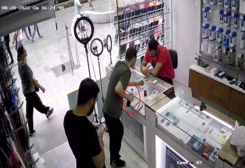 Satış elamanı Arif Oğuz, "Olay cumartesi günü saat 16.00 sıralarında gerçekleşti. Hırsız, müşteri kılığında dükkana geldi. Telefonunda arıza olduğunu söyledi. Biz onun telefonunu incelerken, o da yeni bir telefon almak istediğini bize bildirdi. Bizde vitrinden yeni bir telefon verdik ona. Hırsız bizim verdiğimiz telefonu incelerken, bizde hırsızın arızalı telefonunu incelemeye başladık. O sırada hırsız bizim vitrinden verdiğimiz telefonu cebine attı. Daha sonra hırsızın bize verdiği bir telefonda bir arıza olmadığını anladık, telefonu geri verdik ve hırsız dükkandan uzaklaştı. Ardından vitrinden eksik olan telefonu tespit edince polise bildirdik. Kamera kayıtlarından izlediğimizde müşteri kılığındaki hırsızın telefonu cebine indirdiğini gördük. Telefonun değeri 3 bin 500 TL’ydi. Belki çok yüksek değil ama insanların yoğunluklarından veya dalgınlıklarından fırsat bilip kandırılması kötü bir olay" dedi.