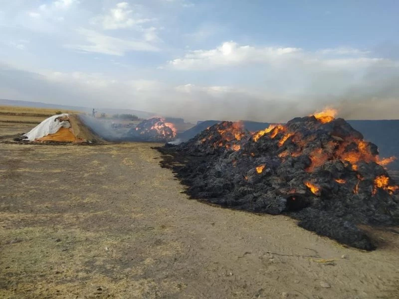 Erzurum’un Horasan ilçesine bağlı Harçlı Mahallesi’nde çok sayıda balya ot ve saman yanarak kül oldu.