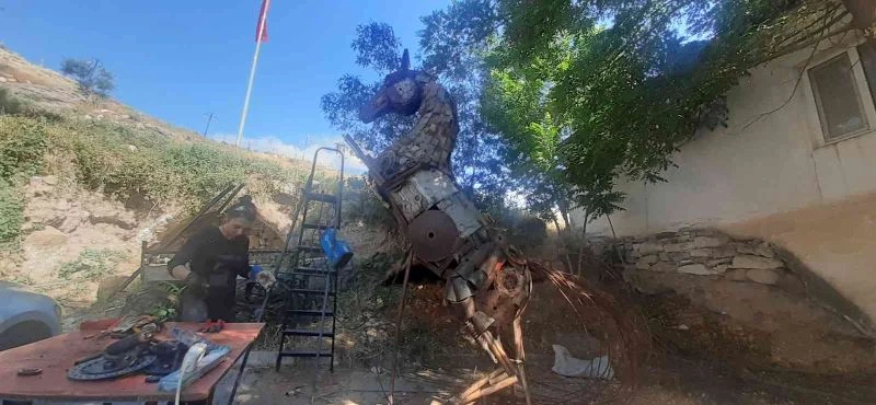Hurdacıdan bulduğu bir çok hurdayı değerlendirdiğini söyleyen Bayer, "Araba balataları, bisiklet zincirleri, inşaat demirleri gibi birçok hurdayı kullanabiliyorum. Biz önce kafamızda tasarlıyoruz. Daha sonra hurdacıya gidiyoruz. Oradan malzeme seçerek alıyoruz. Burada da yerinde yapboz gibi tek tek yerleştiriyoruz” şeklinde konuştu.