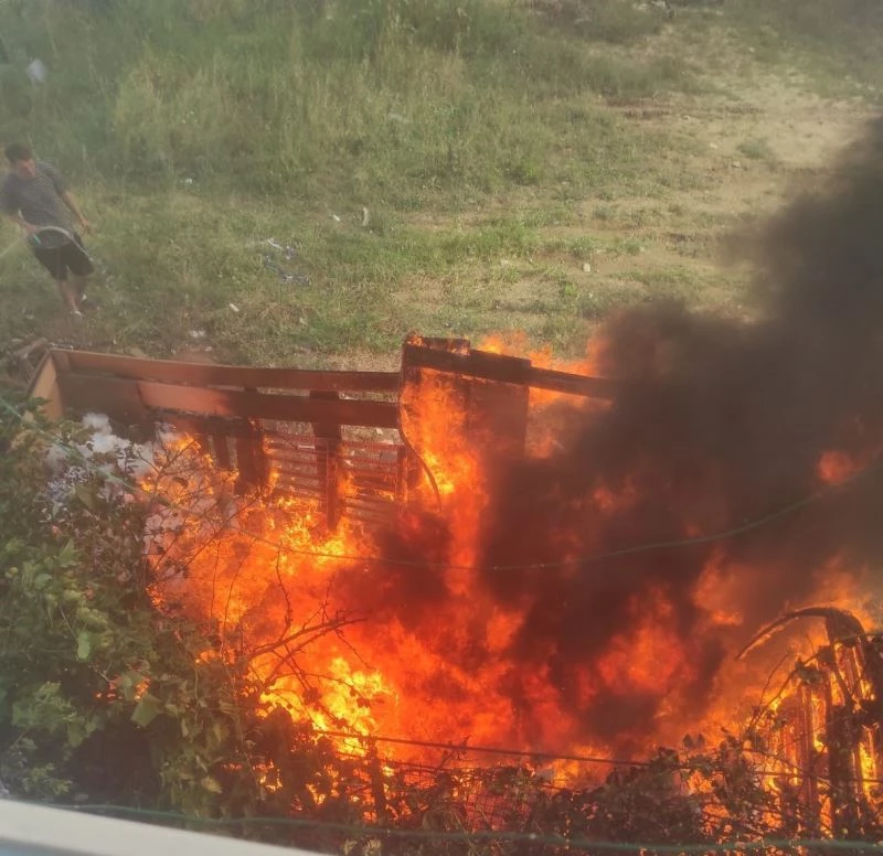 Kocaeli’nin Gebze ilçesinde hurdalık olarak kullanılan kulübe alev alev yandı.