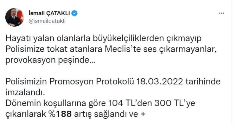 “Hayatı yalan olanlarla büyükelçiliklerden çıkmayıp Polisimize tokat atanlara Meclis’te ses çıkarmayanlar, provokasyon peşinde. Polisimizin Promosyon Protokolü 18.03.2022 tarihinde imzalandı. Dönemin koşullarına göre 104 TL’den 300 TL’ye çıkarılarak yüzde 188 artış sağlandı ve 6 ayda bir de memur maaş zammı oranında artış getirildi. Değişen ekonomik koşullar nedeniyle Polisimize ve Bakanlığımızın diğer personeline yönelik VakıfBank ile maaş promosyonuna ilişkin görüşmeler bir aydır devam ediyor. Farkındayız, rol çalmaya çalışıyorsunuz.”