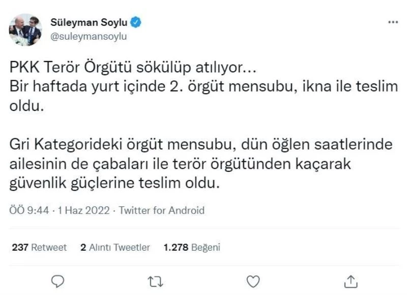 İçişleri Bakanı Süleyman Soylu, sosyal medya hesabından yaptığı paylaşımda bir haftada yurt içinde ikinci örgüt mensubunun teslim olduğunu duyurdu. Bakan Soylu, teslim olan örgüt mensubunun gri kategoride olduğunu belirterek, “PKK terör örgütü sökülüp atılıyor. Bir haftada yurt içinde ikinci örgüt mensubu ikna ile teslim oldu. Gri kategorideki örgüt mensubu, dün öğlen saatlerinde ailesinin de çabaları ile terör örgütünden kaçarak güvenlik güçlerine teslim oldu” ifadelerine yer verdi.