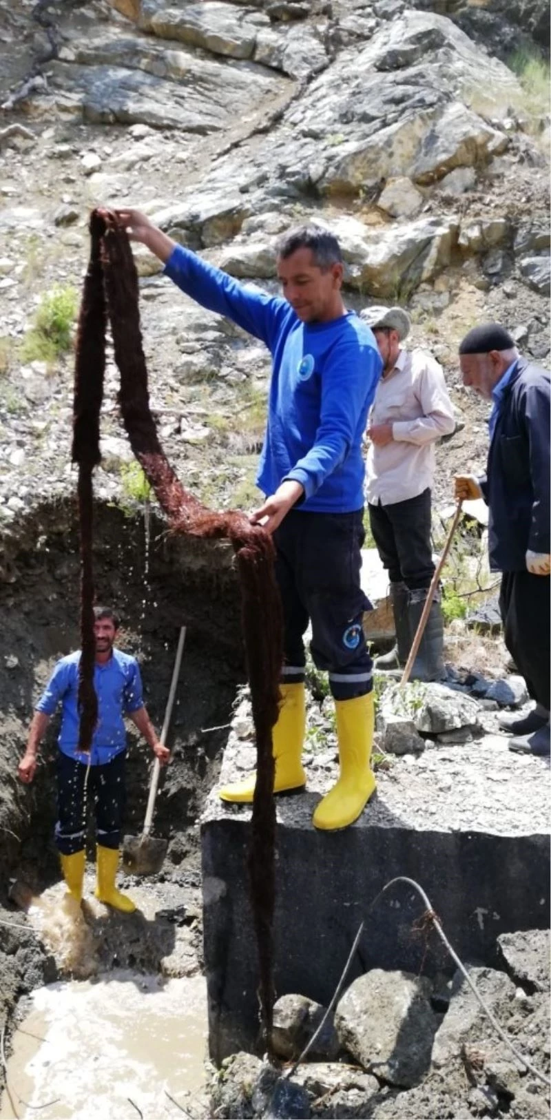 Kahramanmaraş’ın Ekinözü ilçesine bağlı Yeniköy Mahallesi’nde içme suyu temin edilen borunun içinden 6 metrelik ağaç kökü çıktı.