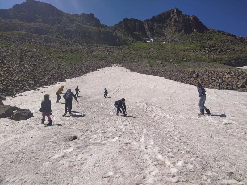 Aileleriyle birlikte gittikleri yaylalarda kar ve buz kütlelerini gören Iğdırlı minik çocuklar, kartopu oynayıp ellerine aldıkları naylon poşetlerle kayarak Haziran ayında karın tadına vardı.