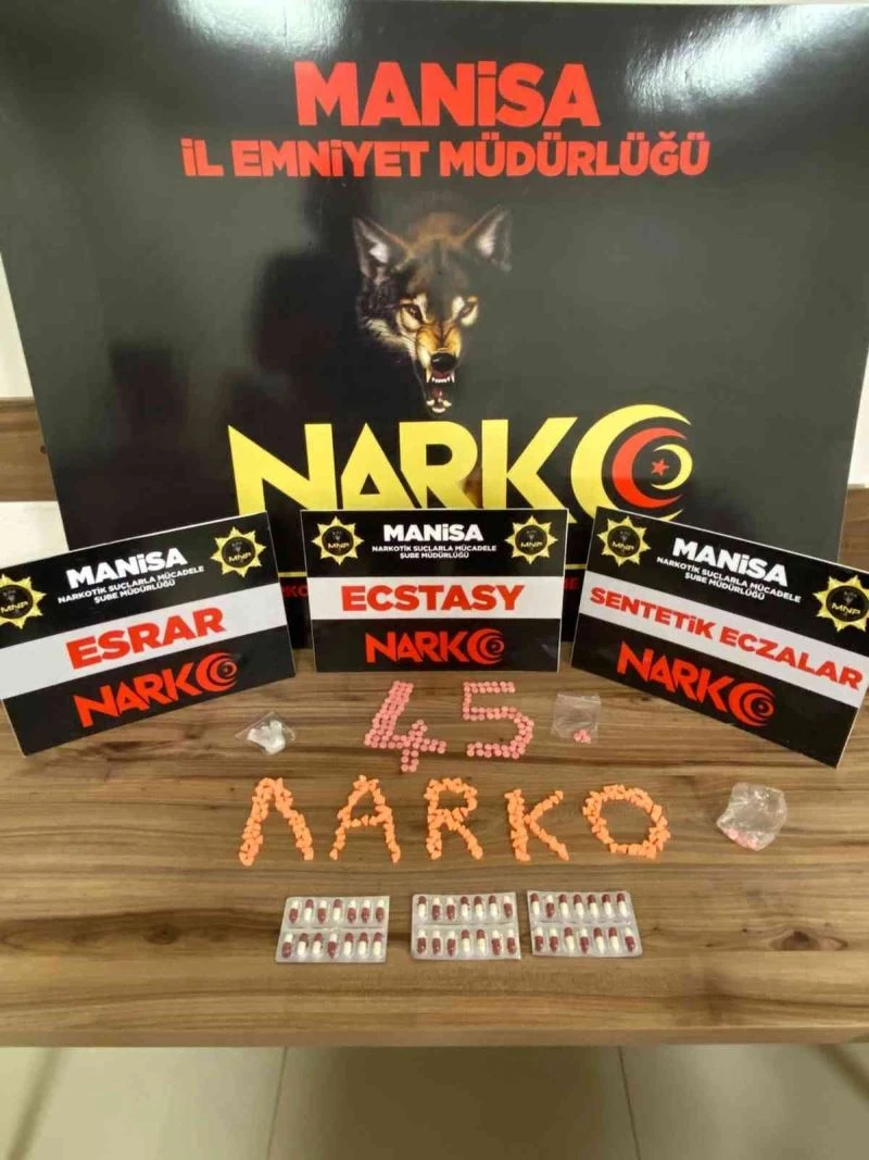 Manisa İl Emniyet Müdürlüğü Narkotik Suçlarla Mücadele Şube Müdürlüğü görevlilerince uyuşturucu veya uyarıcı madde ticareti yapan, nakleden ve kullanan şahıslara yönelik yapılan çalışmalarda Şehzadeler ilçesinde durdurulan 4 kişinin üzerinde yapılan aramada, 53,63 gram esrar maddesi, 5 adet ecstasy hap ele geçirilerek, 4 şüpheli hakkında adli işlem yapıldı. Konuyla ilgili şahısların uyuşturucu maddeyi satın aldığı kişinin ikametinde yapılan aramada ise 324 adet ecstasy hap, 42 adet sentetik ecza hapı ele geçirildi. T.Ö. (28) isimli şüpheli şahıs ’Uyuşturucu veya uyarıcı madde imal ve ticareti yapmak’ suçundan gözaltına alınarak sevk edildiği adli makamlarca tutuklandı.