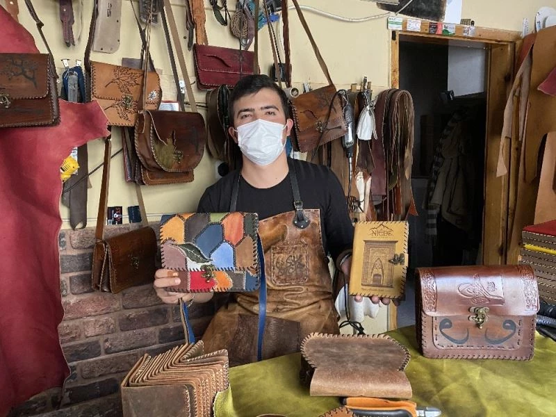 Merakla başladığı deri aksesuar yapımında kendini geliştiren Selman Kaya atölyede deri çanta, cüzdan, defter üretiyor.