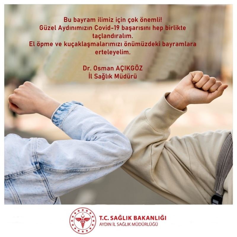 Geçtiğimiz gün Aydın Valisi Hüseyin Aksoy’un başkanlığında gerçekleştirilen İl Pandemi Kurulu toplantısı sonrasında da bayram süresince alınan tedbirler belirlenirken, İl Sağlık Müdürü Osman Açıkgöz de yayınladığı mesajla Aydınlıların Bayramı’nı kutlayarak tedbirlere uyulması konusunda uyarı da bulundu. Vatandaşların sağlığını koruyabilmesi için tedbirlere uyulmasının önemine dikkat çeken Açıkgöz, yayımladığı mesajında “Bu bayram ilimiz için çok önemli. Güzel Aydınımızın Covid-19 başarısını hep birlikte taçlandıralım. El öpme ve kucaklaşmalarımızı önümüzdeki bayramlara erteleyelim” ifadelerine yer verdi.