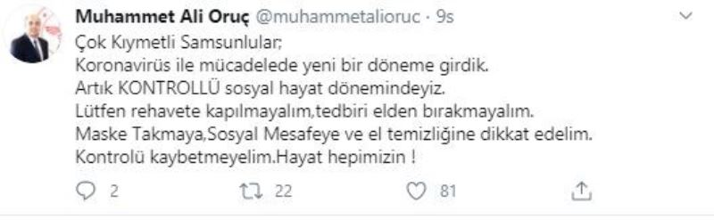 Maske kullanımına ve fiziksel mesafeye dikkat edilmesini isteyen Muhammet Ali Oruç, “Çok kıymetli Samsunlular, korona virüsü ile mücadelede yeni bir döneme girdik. Artık kontrollü sosyal hayat dönemindeyiz. Lütfen rehavete kapılmayalım, tedbiri elden bırakmayalım. Maske takmaya, fiziksel mesafeye ve el temizliğine dikkat edelim. Kontrolü kaybetmeyelim. Hayat hepimizin” ifadelerini kullandı.