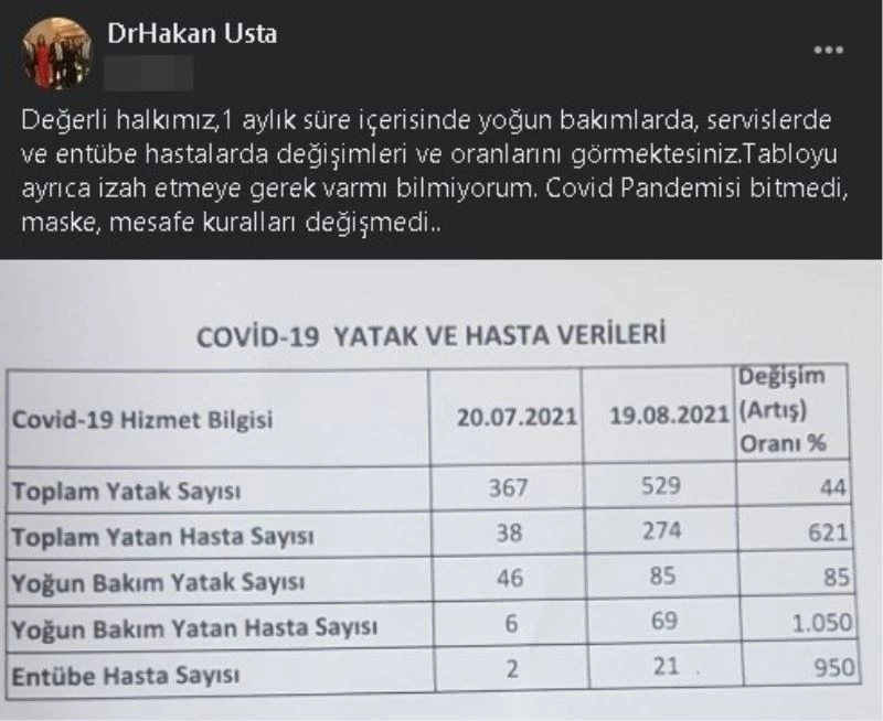 Trabzon İl Sağlık Müdürü Hakan Usta, Covid-19 yatak ve hasta verilerini paylaşarak, 1 ayda artan vaka sayılarına dikkat çekti.