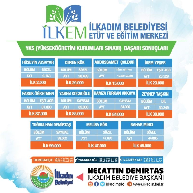 Yaşardoğu, Derebahçe, Kadifekale ile 3 farklı şubede eğitim ve öğretime katkı ve destek hizmetini sürdüren İlkadım Belediyesi Etüt ve Eğitim Merkezi (İLKEM) 263 öğrenciyi üniversiteye hazırlık kursu ile sınava hazırladı. 27-28 Haziran’da tarihlerinde yapılan TYT ve AYT sınavlarına deneyimli öğretmenler eşliğinde hazırlanan öğrenciler başarıyı yakaladı.