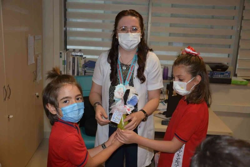Şehit Erkan Kendirci İlkokulu ve Kuzeykent İlkokulu öğrencileri, poliklinik muayenesi yapan doktorlar ile sağlık çalışanlarını, kliniklerde görev yapan hemşireleri, kat görevlilerini, sekreterleri de ziyaret ederek maskeden yaptıkları çiçekleri takdim ettiler.