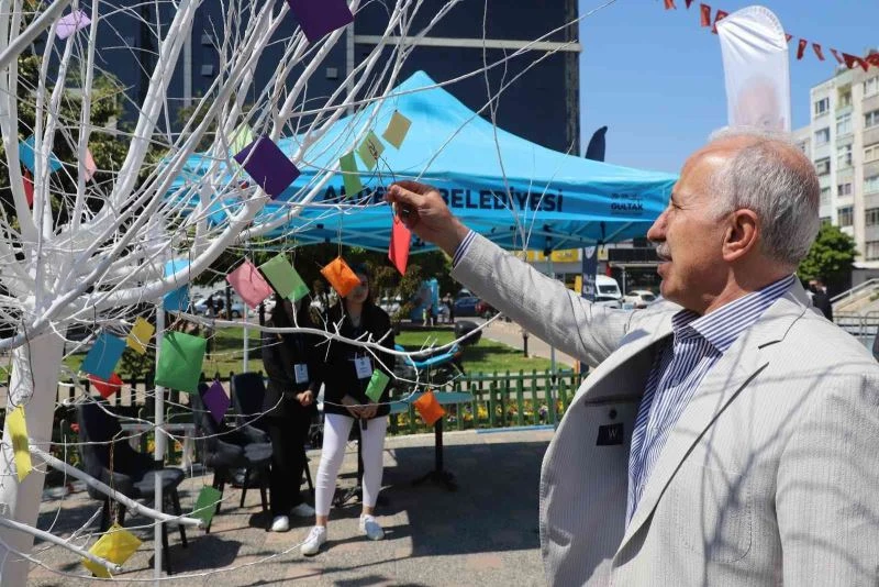 Etkinliğe katılan Akdeniz Belediye Başkanı Muhammet Mustafa Gültak, başkan yardımcıları, birim müdürleri ve belediye personeli, dilek ağacına asılı zarfları tek tek çekerek, öğrencilerin dileklerini okudu ve kayıt altına aldı. Çekilen zarflara yazılı tüm talepler en kısa sürede temin edilerek, Abdullah Şahutoğlu ile Camili İlköğretim Okullları ziyaret edilecek ve burada çocuklara hediyeleri teslim edilecek. Dilek ağacından bir zarf çeken Başkan Gültak, Abdullah Şahutoğlu ilkokulu 4/A sınıfından Tolga Kuş adlı öğrencinin ‘muhabbet kuşu’ istediğini yazdığı dileği çekti.