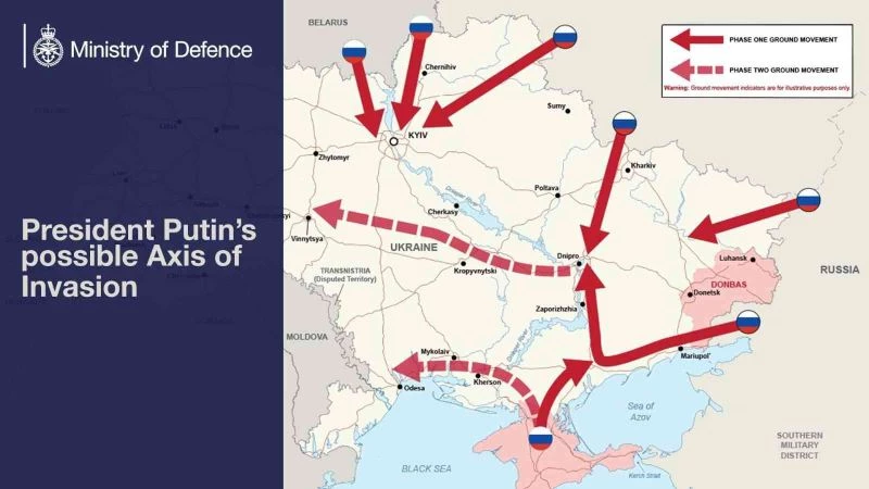 Savunma Bakanlığı, “Başkan Putin’in muhtemel işgal ekseni gösterilmektedir” başlığıyla 2 aşamalı muhtemel işgal planına ait paylaştığı haritada, birinci aşamada Rusya’nın Belarus sınırı boyunca iki noktadan ve Rusya’nın batı sınırından bir noktadan Kiev’e doğru kara harekatı gerçekleştirebileceğini belirtti. Haritada ayrıca, iki noktadan Dnipro’ya, Kırım’dan Mariupol’a ve Rusya sınırından Luhansk yönüne doğru potansiyel birinci aşama yer hareketlerine yer verildi.