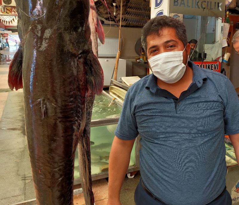 Kahramanmaraş’ta bir balıkçı esnafında satışa sunulan yayın balığı görenlerin ilgi odağı oldu.