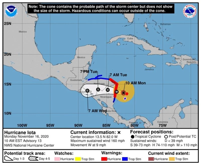 ABD Ulusal Kasırga Merkezi görevlilerinden Stacy Stewart, “Iota’nın hızla yoğunlaşmaya devam etmesi bekleniyor ve bu gece Orta Amerika kıyılarına yaklaştığında muhtemelen bir kategori 5 kasırgası olacak" ifadelerini kullandı. Stewart, "Honduras ve Nikaragua’daki sel ve toprak kaymaları, Eta Kasırgası’nın ardından buralarda daha da kötüleşebilir ve bu da potansiyel olarak yıkıcı etkilere neden olabilir" dedi.
