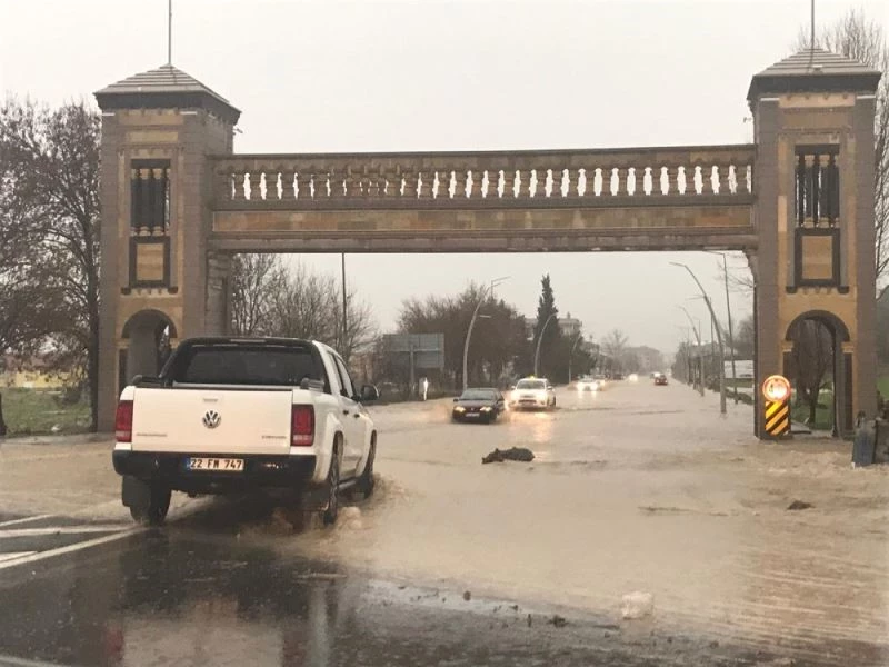 Edirne’nin İpsala ve Enez ilçelerinde şiddetini artırarak devam eden sağanak yağış hayatı olumsuz etkiledi. Yağmur suları sel olup yola akarken şehir girişi kapandı, araçlar şehre giremedi.
