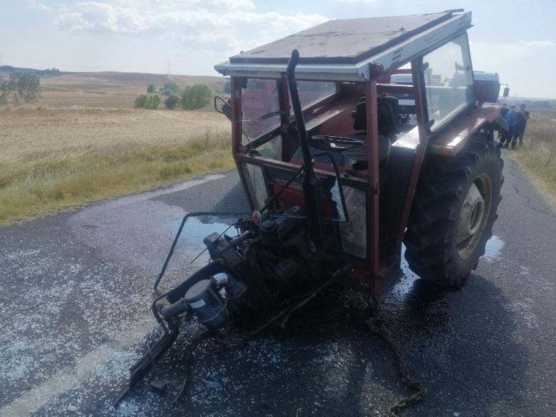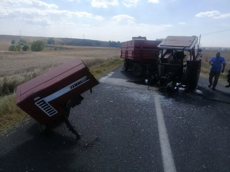Tekirdağ’ın Muratlı ilçesinde meydana gelen trafik kazasında 3 römorkun bağlı bulunduğu traktör ikiye bölündü.