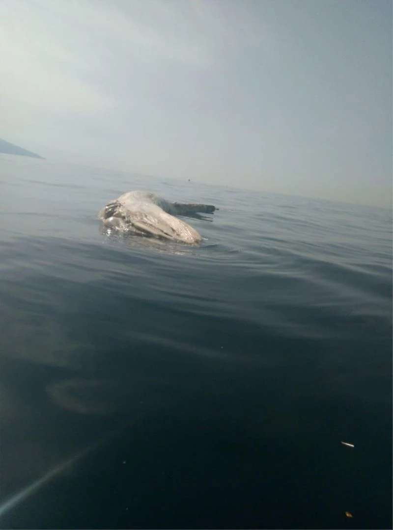 İskenderun Körfezi’nde balıkçılar, 15 metre uzunluğunda ölü balinaya rastladı.